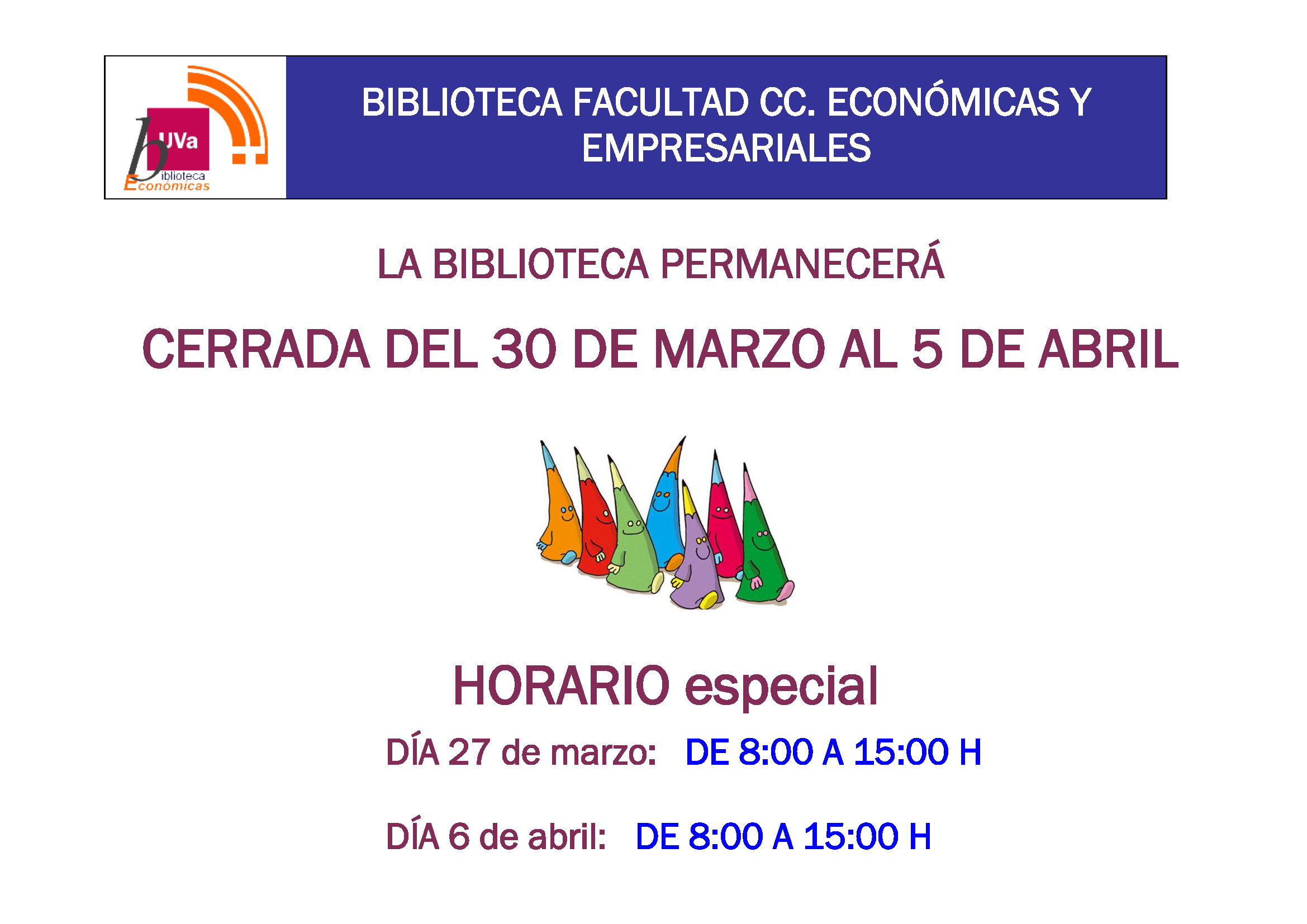 Con motivo de la Semana Santa se acercan días de cierre la de la UVa y, por tanto, de las bibliotecas del sistema. Si tienes algún material prestado o si quieres tenerlo (ya sabes que si te gusta leer en épocas de descanso, te lo ponemos fácil proporcionándote obras de ocio, no todo es estudiar), anota los días en los que va a estar cerrada la Biblioteca y muy especialmente los de horario solo de 8:00-15:00, el 27 de marzo y el 6 de abril.