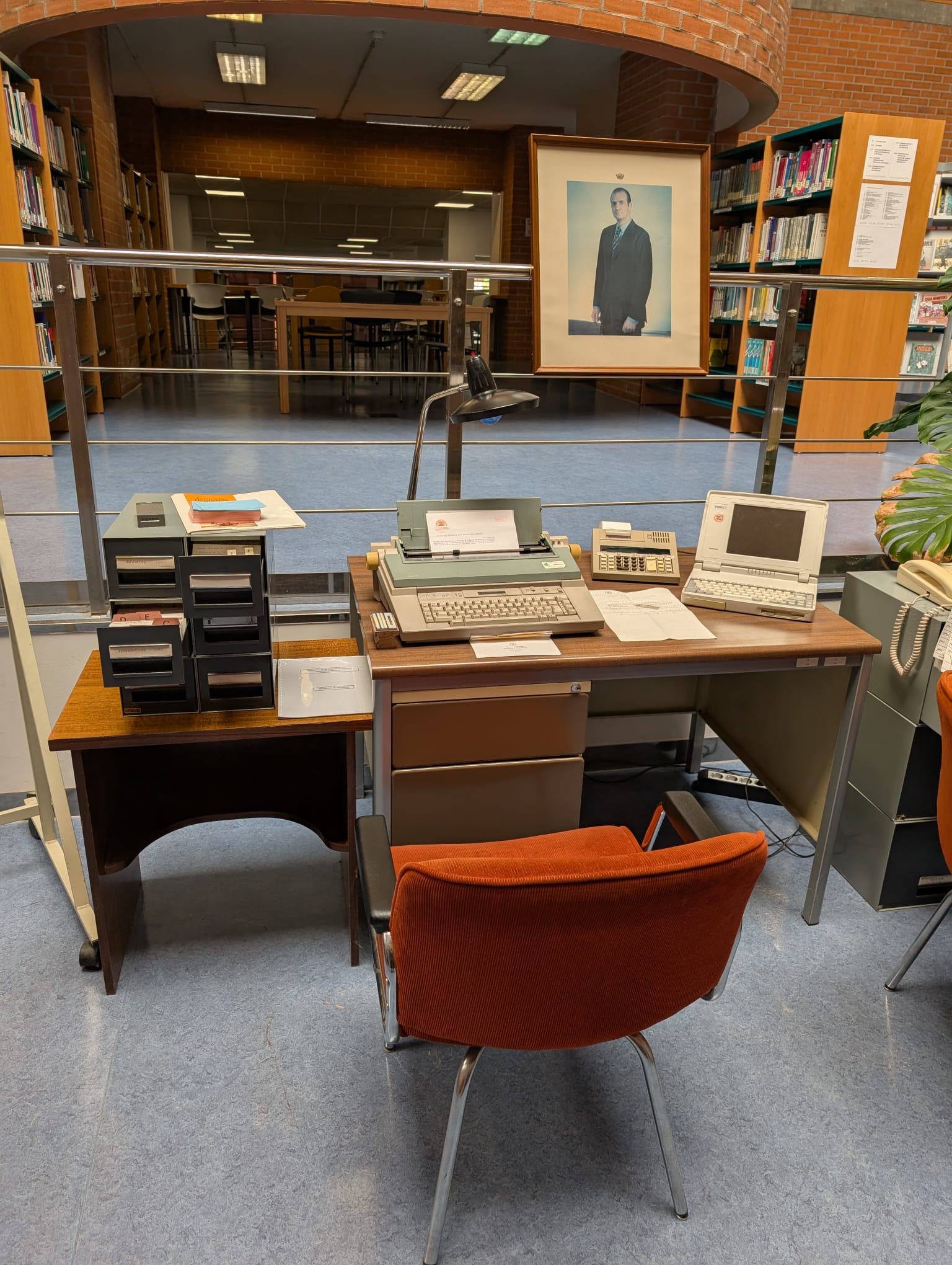 En este curso en el que nuestra Facultad celebra su cincuenta aniversario, y aprovechando el mes tan especial para las bibliotecas como el de abril, en el se incluye la festividad del Día del Libro, hemos querido contribuir de alguna manera a estas celebraciones a la vez. Se nos ha ocurrido recrear una estampa retrospectiva de lo que era una zona de trabajo de la biblioteca hace…algunos años. Para ello hemos montado una pequeña exposición con algunos de los objetos que eran muy habituales en las bibliotecas de otras épocas y que hoy en día se ven casi como reliquias de coleccionismo. Algunos de ellos en la actualidad serían incluso políticamente incorrectos, pero no hemos querido hacer presentismo, sino disfrutar de la foto retrospectiva. Eso sí, con tecnología o sin ella, el usuario siempre era lo primero, en eso no hemos cambiado.